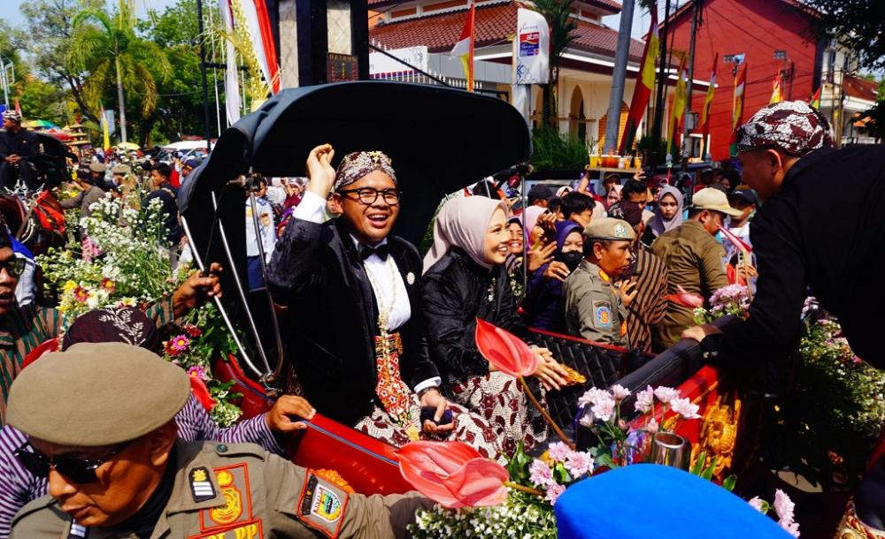 Bupati Batang M. Faiz Kurniawan (kiri), menebar atau sawur uang koin saat kirab budaya Memperingati HUT Ke-59 Kabupaten Batang di Jalan Veteran Batang, Kabupaten Batang, Minggu (27/4/2025). Bupati Batang mengatakan, ini adalah tradisi yang sangat penting, karena kita mengingatkan kepada generasi muda untuk terus menjaga dan melestarikan budaya yang menjadi keunikan Kabupaten Batang. Dalam kirab budaya menyiapkan uang sawuran sebesar Rp10 juta dalam bentuk uang koin untuk disebarkan masyarakat. MC Batang, Jateng/Jumadi/Sri Rahayu
