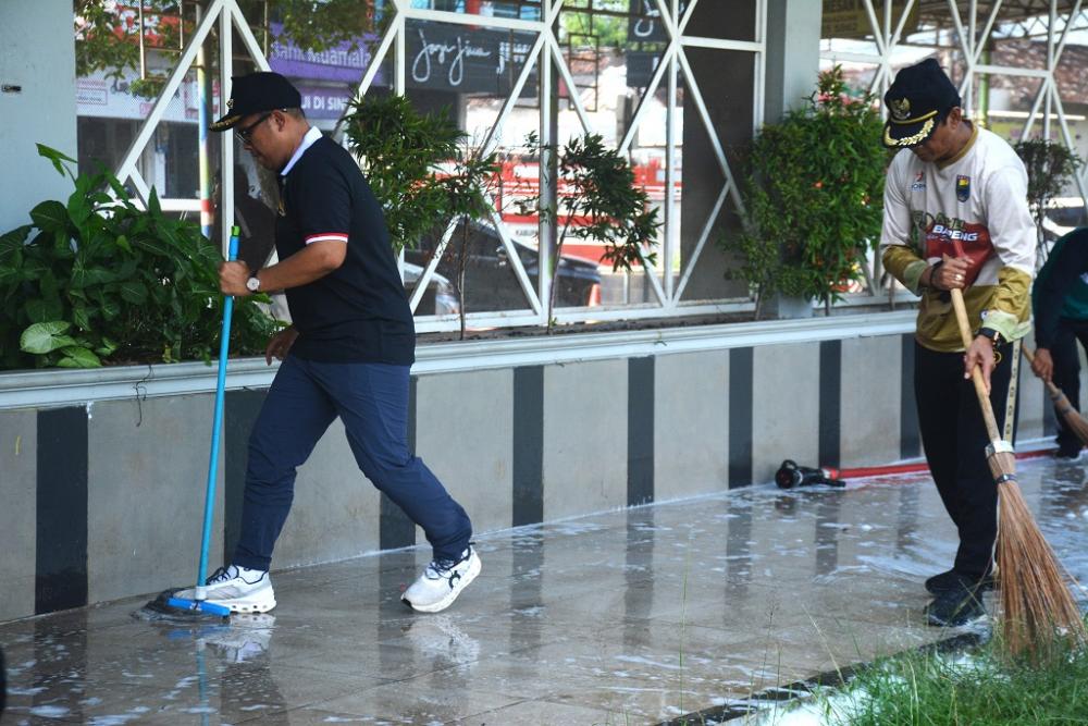 Bupati Batang M. Faiz Kurniawan (kiri) bersama personel Satpol PP membersihkan lantai di area Alun-alun Batang, Kabupaten Batang, Selasa (3/6/2025). Bupati Batang berharap, semoga kebersihan dan penghijauan fasilitas umum di Kabupaten Batang tidak bisa dilakukan pemerintah saja, tapi masyarakat juga harus diajak agar muncul kepedulian bersama. MC Batang, Jateng/Jumadi/Sri Rahayu