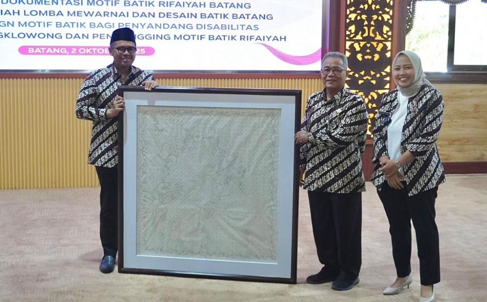 Bupati Batang M. Faiz Kurniawan (kiri), memamerkan dokumentasi motif batik rifaiyah usai Pengukuhan Dekranasda di Aula Bupati Batang, Kabupaten Batang, Kamis (2/10/2025). Bupati Batang mengatakan, demi menjaga agar motif-motif langka itu, terlindungi. Perlindungan yang akan kami lakukan, motif tersebut dialihmediakan secara digital serta mendaftarkan ke Arsip Nasional Republik Indonesia (ANRI). MC Batang, Jateng/Jumadi/Sri Rahayu