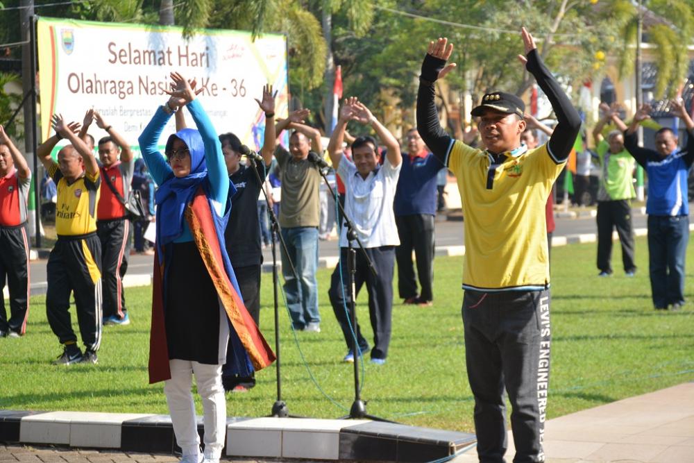 Bupati Batang Wihaji (kanan) didampingi Ketua Tim Penggerak Pemberdayaan dan Kesejahteraan Keluarga Kabupaten Batang Uni Kuslantasi Wihaji (kiri), melakukan Senam Kebugaran Jasmani usai Apel Pagi Peringatan Hari Olah Raga Nasional (Haornas) ke-36 di halaman Pendopo Kabupaten Batang, Jumat (13/9/2019). Senam juga diikuti oleh seluruh jajaran Organisasi Perangkat Daerah, Kodim, kepolisian, dan pelajar se-Kabupaten Batang. MC Batang, Jateng/Jumadi/Ardhy