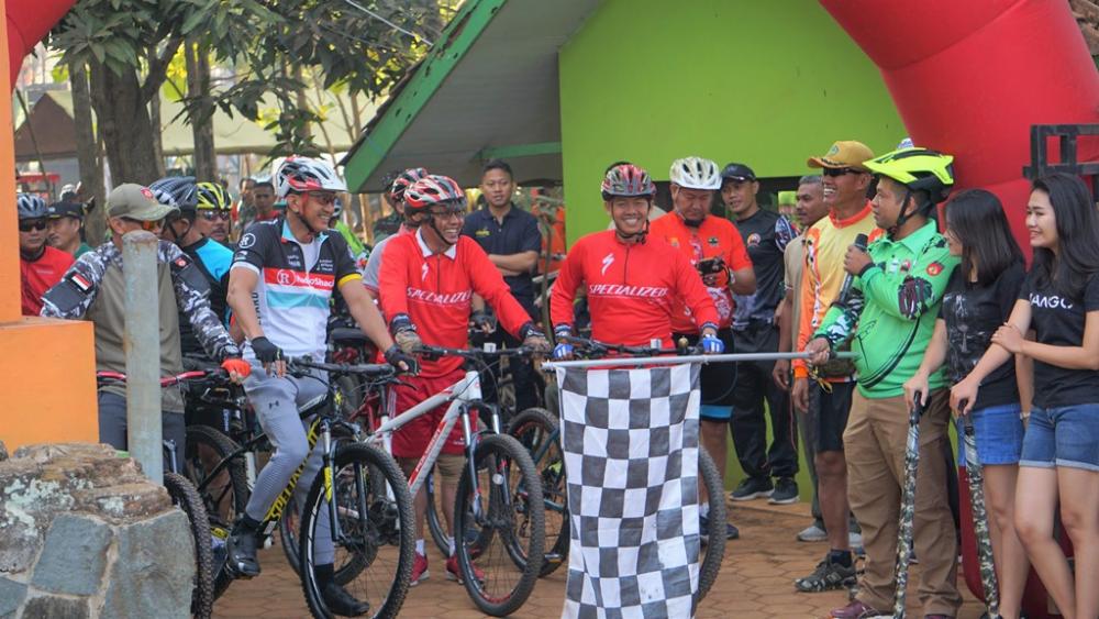 Komandan Kodim 0736/Batang Letkol Kav Henry Rudi Judianto Napitupulu (ketiga kanan), mengangkat bendera sebagai tanda pelepasan Gowes Sepeda Santai Pamen dan Kowad Dam IV/Diponegoro di kawasan Hutan Kota Rajawali Kabupaten Batang, Jumat (13/9/2019). Kegiatan ini dihadiri sekitar 300 peserta antara lain, Kodim, Polres, Perwakilan Organisasi Perangkat Daerah, dan komunitas sepeda Batang. MC Batang, Jateng/Roza/Ardhy