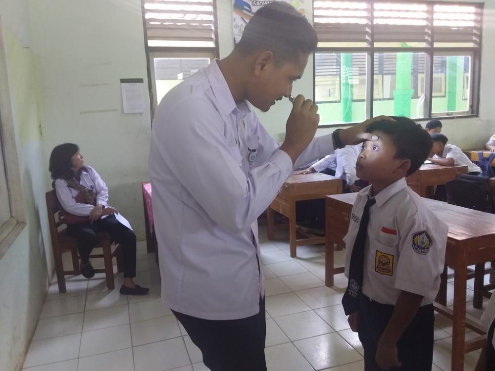 Petugas Badan Narkotika Nasional Kabupaten Batang Ardhi Rahmawan (kedua kiri), memeriksa pupil mata siswa (kanan) di ruang kelas SMPN 1 Blado Kabupaten Batang, Selasa (17/9/2019). Ardhi menjelaskan, jika mengonsumsi ganja dan heroin membuat pupil mata akan mengecil, ekstasi membuat pupil mata membesar, mariyuana membuat mata memerah, dan alkohol membuat mata tampak berkaca-kaca. MC Batang, Jateng/Heri/Ardhy