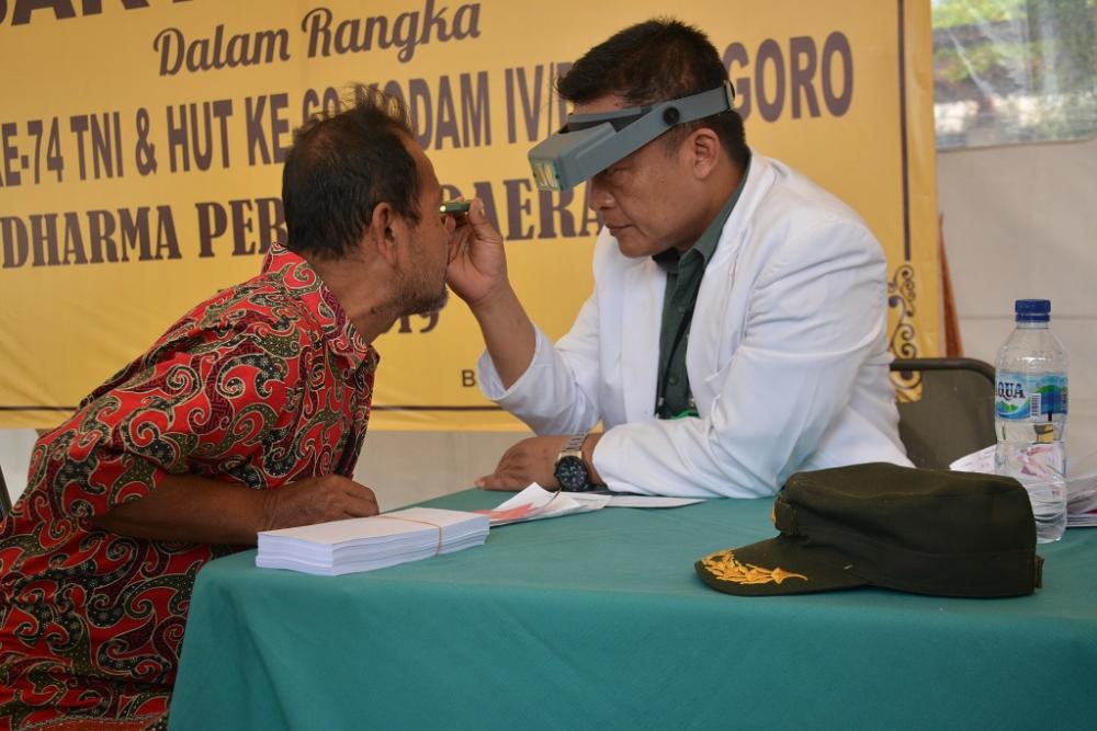 Seorang warga (kiri), memeriksa kesehatan mata gratis dalam Peringatan Hari Ulang Tahun Tentara Nasional Indonesia ke-74 dan Kodam IV/Diponegoro ke-69 di Alun-alun Kabupaten Batang, Rabu (18/9/2019). Kegiatan ini diselenggarakan oleh Dinas Kesehatan Kabupaten Batang untuk memeriahkan acara dan akan diberikan kaca mata gratis apabila pasien membutuhkan. MC Batang, Jateng/Jumadi/Ardhy