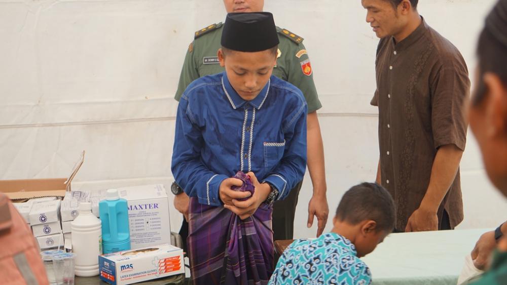 Seorang anak (kemeja biru), mengikuti sunat (khitan) massal dalam Peringatan Hari Ulang Tahun Tentara Nasional Indonesia ke-74 dan Kodam IV/Diponegoro ke-69 di Alun-alun Kabupaten Batang, Rabu (18/9/2019). Sunat massal diikuti oleh 50 anak dari berbagai daerah di Kabupaten Batang. MC Batang, Jateng/Roza/Ardhy