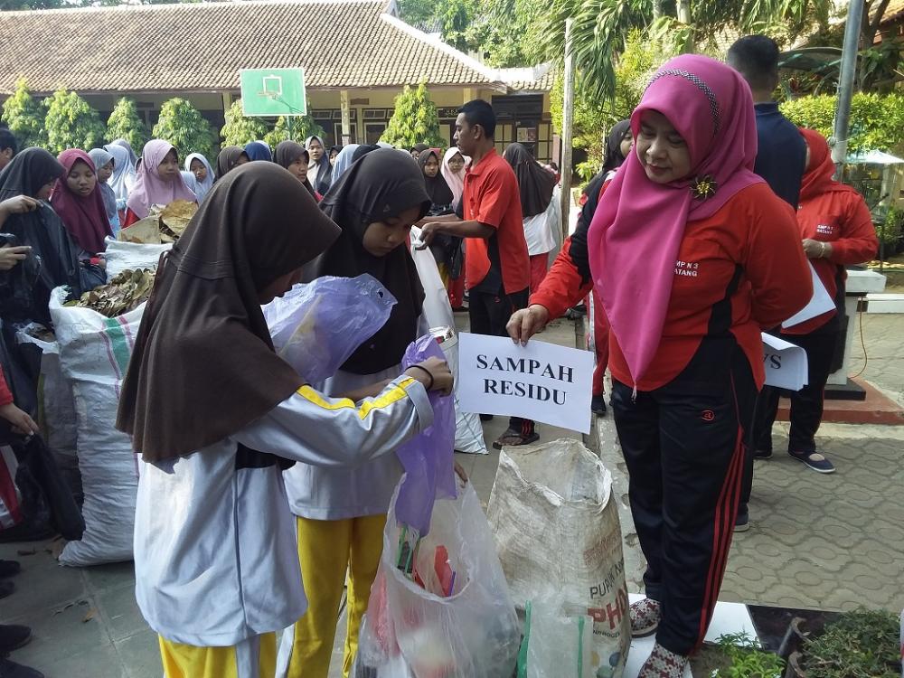 Dua pelajar (kiri) didampingi Wakil Kepala Sekolah Eminingsih (kanan), memisahkan sampah plastik dan organik dalam memperingati World Cleanup Day di halaman SMPN 3 Kabupaten Batang, Sabtu (21/9/2019). Eminingsih mengharapkan anak-anak didik mengurangi pemakaian plastik mulai dari lingkungan sekolah, karena terbuat dari bahan yang sulit terurai. MC Batang, Jateng/Heri/Ardhy